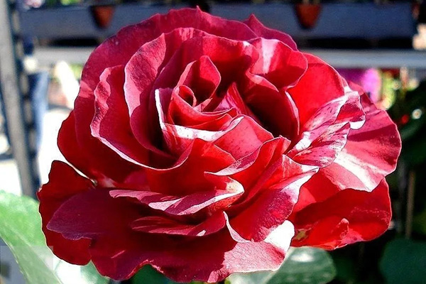 Цветки — крупные, махровые, достигают в диаметре 10 см. Бутоны красные, распустившиеся цветки приобретают тёмно-красный оттенок, на лепестках имеются светло-кремовые прожилки разных оттенков. Цвет их варьируется от розово-пепельного до светло-бордового. В одном цветке — 40-45 лепестков.