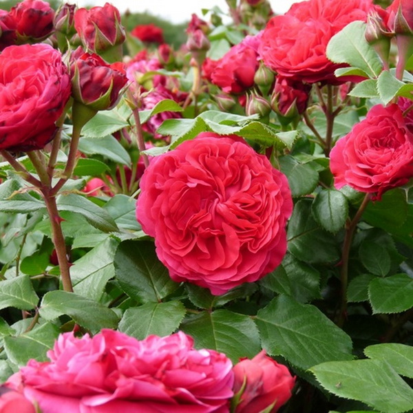 Кусты крепкие со множеством побегов заканчивающихся соцветиями от 2 до 5 шт. Высота кустов 80-110 см. Цветы из 75-80 лепестков красного цвета, легким ароматом. Хорошо переносит дожди. Листья здоровые, стойкие к заболеваниям. Достоинства сорта и его непревзойденный романтический шарм выделяет его среди остальных роз этого типа. Можно использовать в одиночных и групповых посадках.