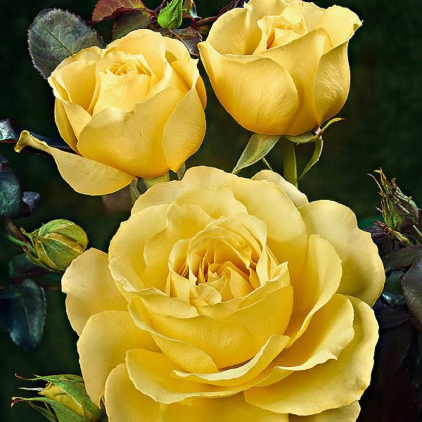 Бутоны заостренные. Цветки соломенно-желтые, с высоким центром, крупные (12—13 см), махровые (38 лепестков), душистые. Листья темно-зеленые, кожистые, еле блестящие, красивые, здоровые. Шипы крупные, крючковидные, редкие. Кусты сильнорослые (до 90 см), прямые, с прочными красно-бурыми побегами. Цветение умеренное. Зимостойкий. Для срезки.