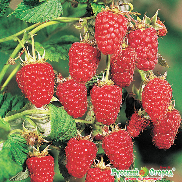 Плоды. Крупные, сухие, блестящие, красного цвета. Форма – ширококоническая. Средний вес – 6 г, самые большие ягоды достигают 12 г. Ягоды легко отделяются, поспев, не размягчаются. По вкусу плоды напоминают лесную малину.