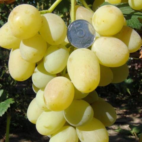 На кусте плоды размещаются на ветках, которые имеют среднюю плотность. Виноградины у данного сорта очень крупные. Вес каждой ягоды может составлять от 10 до 30 грамм. Такие крупные плоды могут достигать размеров небольшой сливы.