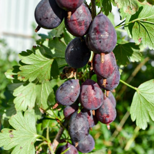 Главным достоинством Черносливового крыжовника считаются его плоды. Ягоды овальной или грушевидной формы, с плотной кожицей, покрытой восковым налетом. Окраска зависит от стадии спелости. Молодые ягоды темно-красные, полностью зрелые – черные. Слабые прожилки можно рассмотреть только в незрелых плодах.